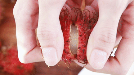它外面长着软软的红色毛刺却并不扎手,看起来有点奇怪。但剥开皮之后,里面的果肉白纯净嫩,内里的肉质甘甜多汁。