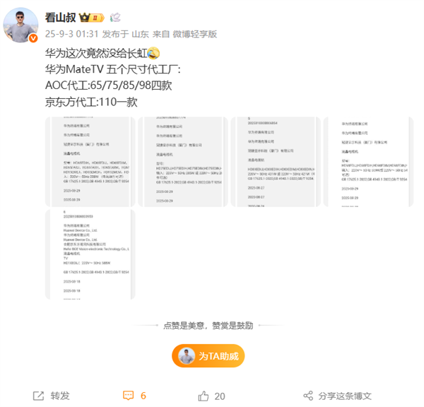 本日,数码博主“看山叔”败露,MateTV 五个尺寸代工场为AOC和京东方。