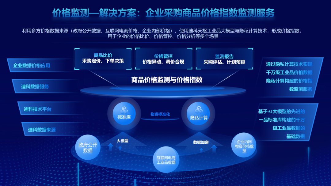 针对工业品价钱信息不透明加多供应链“往复资本”这一痛点问题,天源迪科可向企业提供采购商品价钱指数监测奇迹。诳骗多方价钱数据开端(政府公开数据、互联网电商价钱、企业里面价钱),使用迪科天枢工业品大模子与心事缱绻本领,变成价钱指数,用于企业的价钱比价、价钱管控、价钱分析等多个场景。