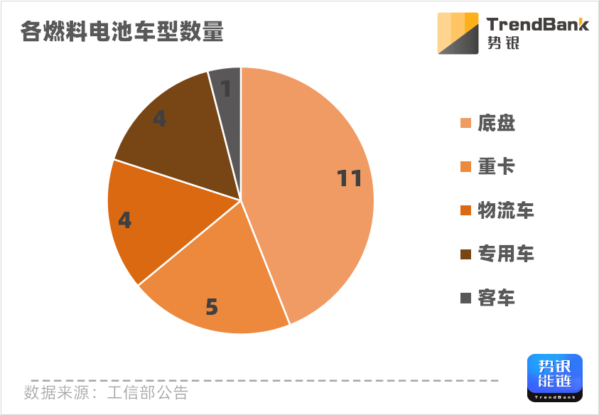 从产物类型看,这次上榜的25款燃料电板产物种类共有5种,其中底盘遥遥朝上,上榜11款;重卡位居第二,为5款;物流车、专用车比肩第三,上榜4款;客车为1款。
